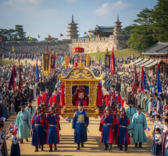 1796년은 조선 정조 치세의 상징이자 절정으로 평가되는 해이다. 정조는 부친 사도세자의 묘를 양주 배봉산에서 수원 화산으로 옮기고, 그를 기리기 위해 화성을 축성했다. 이 해의 화성 행차는 단순한 효심의 발로가 아니라, 정치적 메시지와 국가 개혁 의지가 집약된 대사건이었다. 화성 건설과 행차는 백성의 생활 개선, 군사 방비, 경제 활성화를 함께 도모한 종합적 국가 프로젝트였다.
